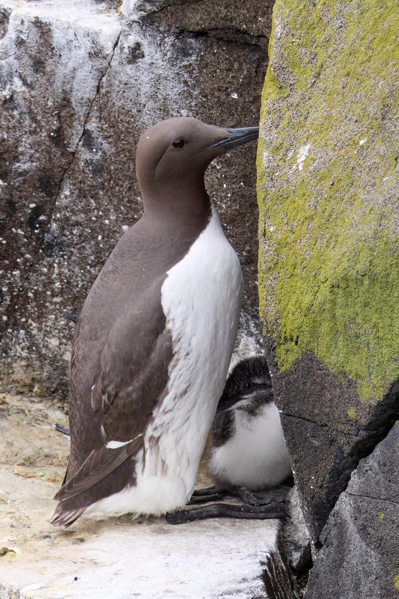 Immer wieder übertönen hohe Schreie den allgemeinen Lärm. Mittlerweile erkennen wir sie als Rufe von jungen Lummen, die meist ohne Eltern im Felsen sitzen. Und da ist auch wieder einer, der kläglich rufend auf einem schmalen Felsband hockt. Die Mama schiebt ihn von hinten sanft an, damit er sich noch einen Schritt näher an den Abgrund wagt. So ganz will er nicht, aber Stück um Stück wird er näher an die Felsenkante bugsiert. Unter ihm sitzt der Papa und ruft hinauf. Und dann ein letzter Schups und der Kleine sitzt auf der nächsttieferen Felsenstufe. Dreißig Zentimeter auf dem langen Weg nach unten sind geschafft.