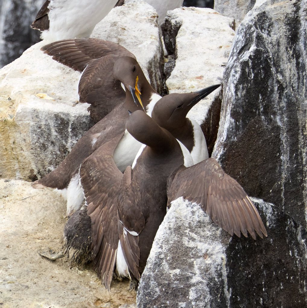 Plötzlich fühlt sich wohl eine andere Lumme gestört und pickt auf den ungebetenen Gast hin. Vor lauter Schreck purzelt er nach unten und landet dieses Mal neben dem Nest eines Tordalks. Auch der kennt keine Gnade und geht mit Schnabel und Flügeln auf den Kleinen los. Verfolgt ihn, bis… – plötzlich ist er verschwunden. Wir konnten noch kurz erkennen, wie er rücklinks über die steile Kante fällt. Und hoffen, dass er sicher unten im Wasser angekommen ist.