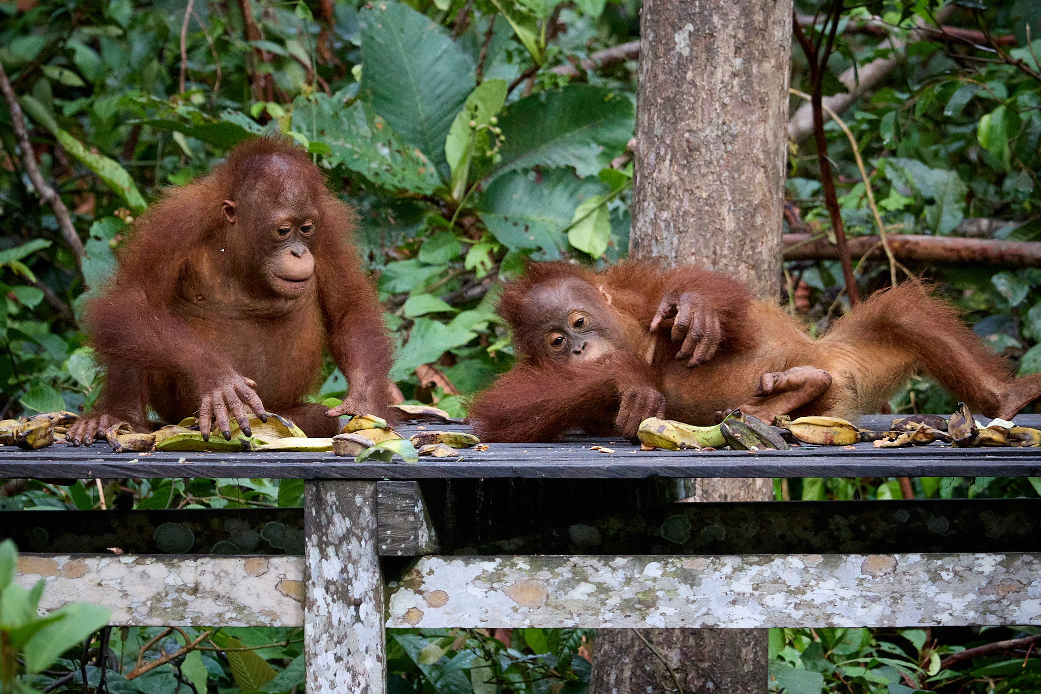 Da finde ich die Youngsters, die einen kleinen Kampf austragen oder vollbepackt mit Bananen in den Baumwipfeln verschwinden, wesentlich interessanter.