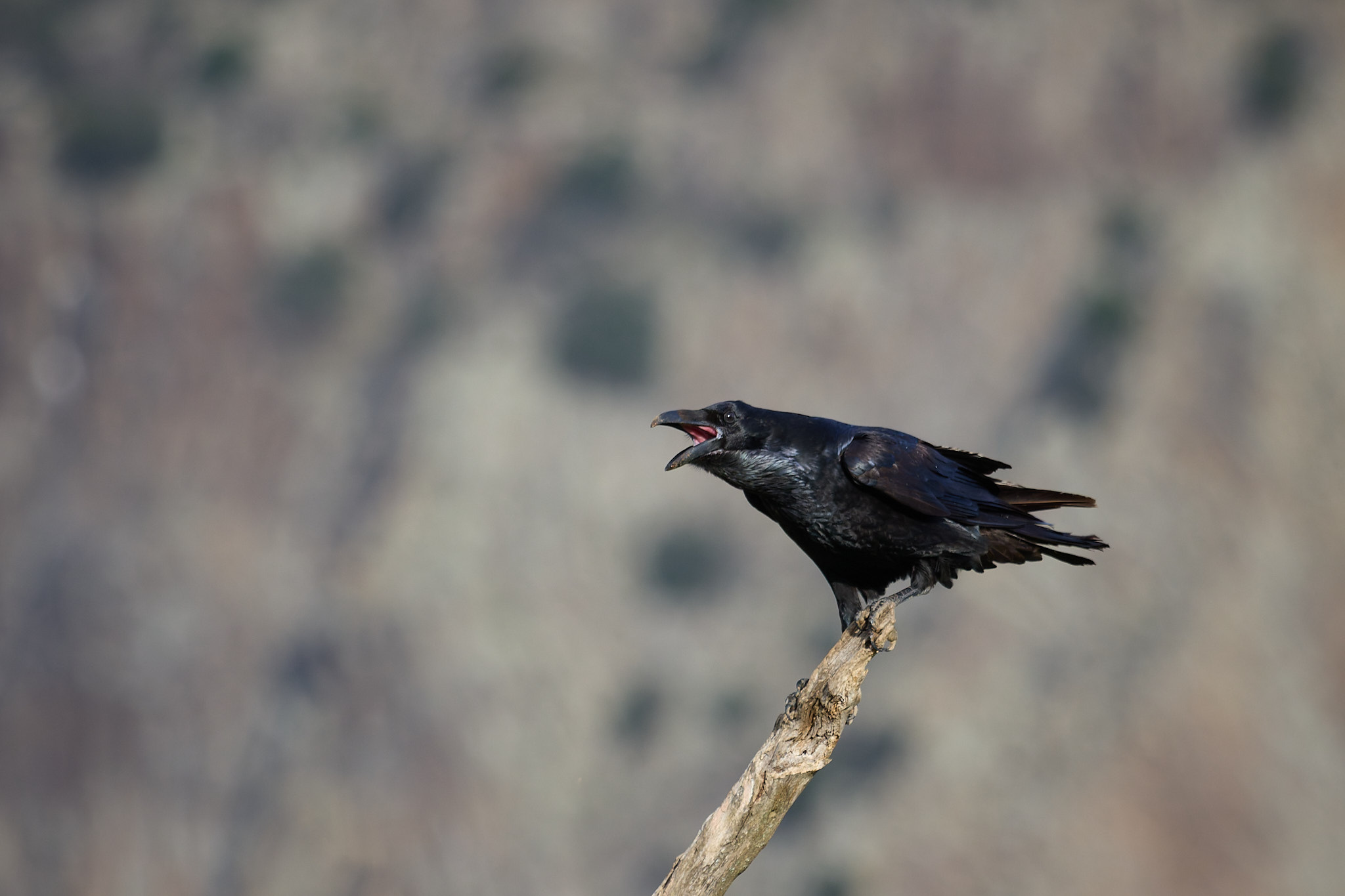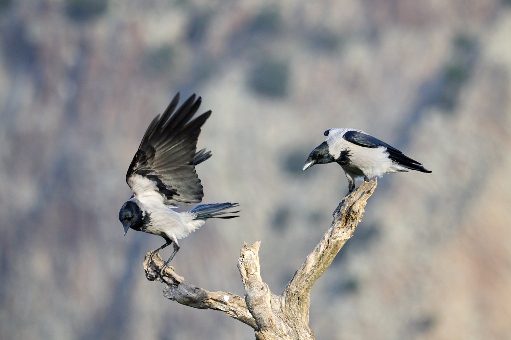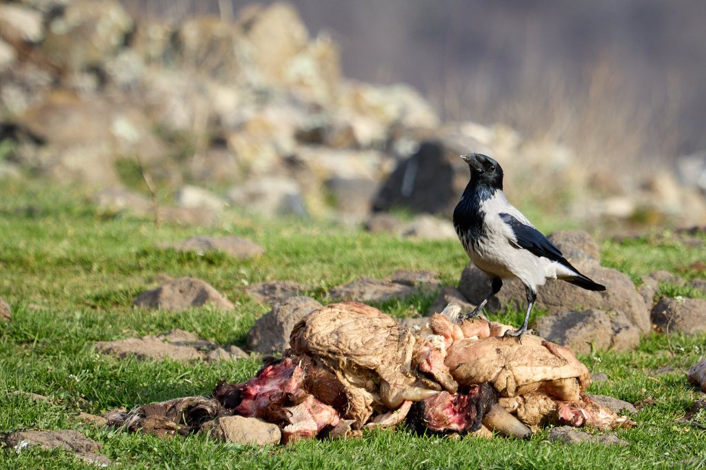 Das Warten geht weiter. Ein paar Nebelkrähen erscheinen und landen vor uns auf den Ästen. Die Kameras klicken, wenigstens ein Fotomotiv. Dann gesellt sich noch ein Kolkrabe dazu und macht sich mit seinen tiefen „rah, rah“ Rufen bemerkbar. Währenddessen haben sich ein paar der Krähen an den ausgelegten Kadaver gewagt, beäugen ihn vorsichtig von allen Seiten und picken versuchsweise in das Fleisch.