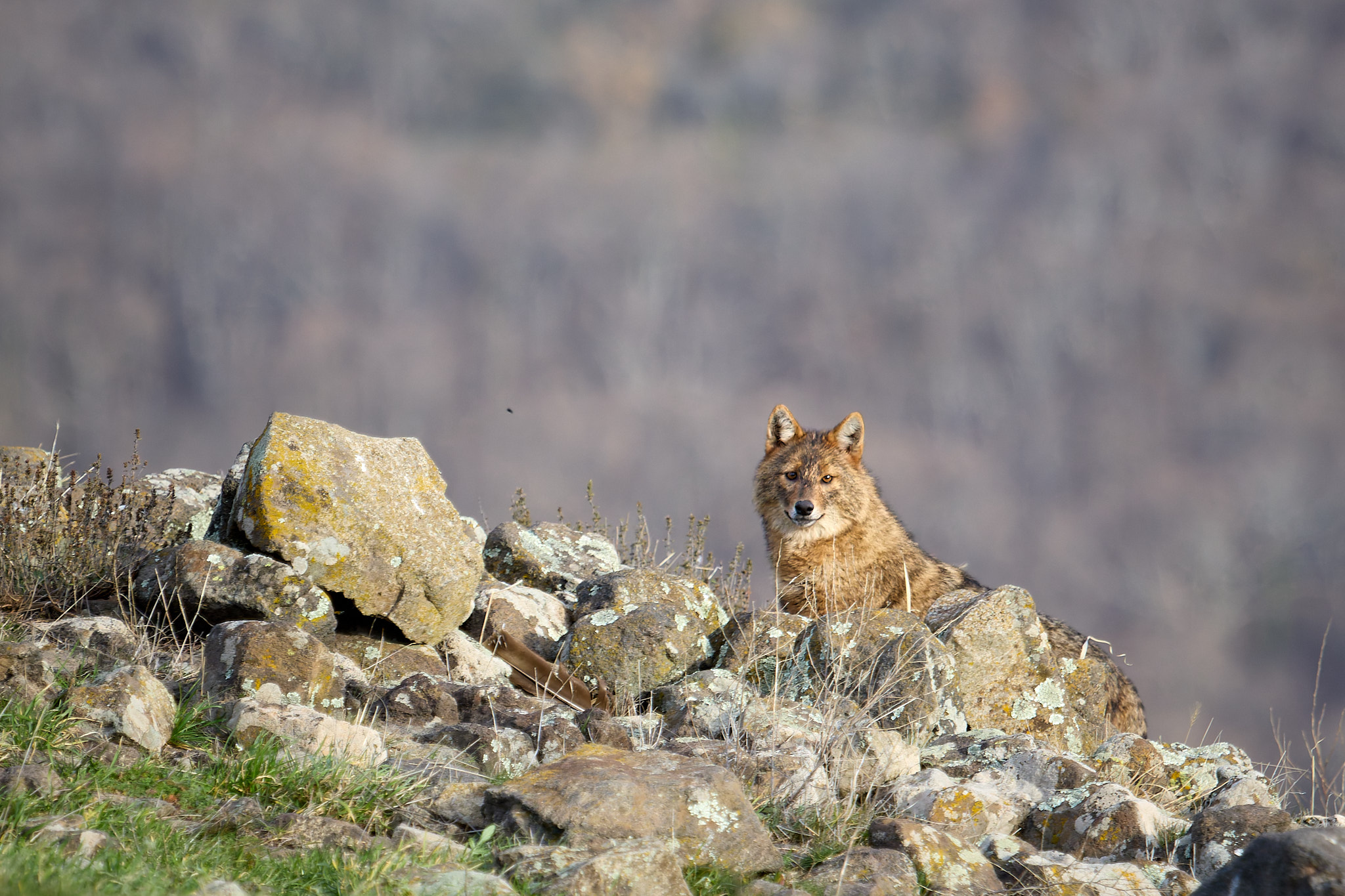 Ich suche weiter die Umgebung ab. Plötzlich eine Bewegung hinter den Felsen: ein Kopf taucht auf und schaut neugierig zu uns herüber. Ein Goldschakal! Behutsam stupse ich meinen Sitznachbarn an, der wohl gerade etwas Schlaf nachholt. Sofort liegt Spannung in der Luft und jeder probiert, sein Objektiv ohne zu schnelle Bewegung auf den Schakal auszurichten. Der steigt kurz über die Felsen und zeigt sich in voller Größe – ist dann aber auch gleich wieder verschwunden. Aber immerhin sind mir ein oder zwei scharfe Bilder gelungen.