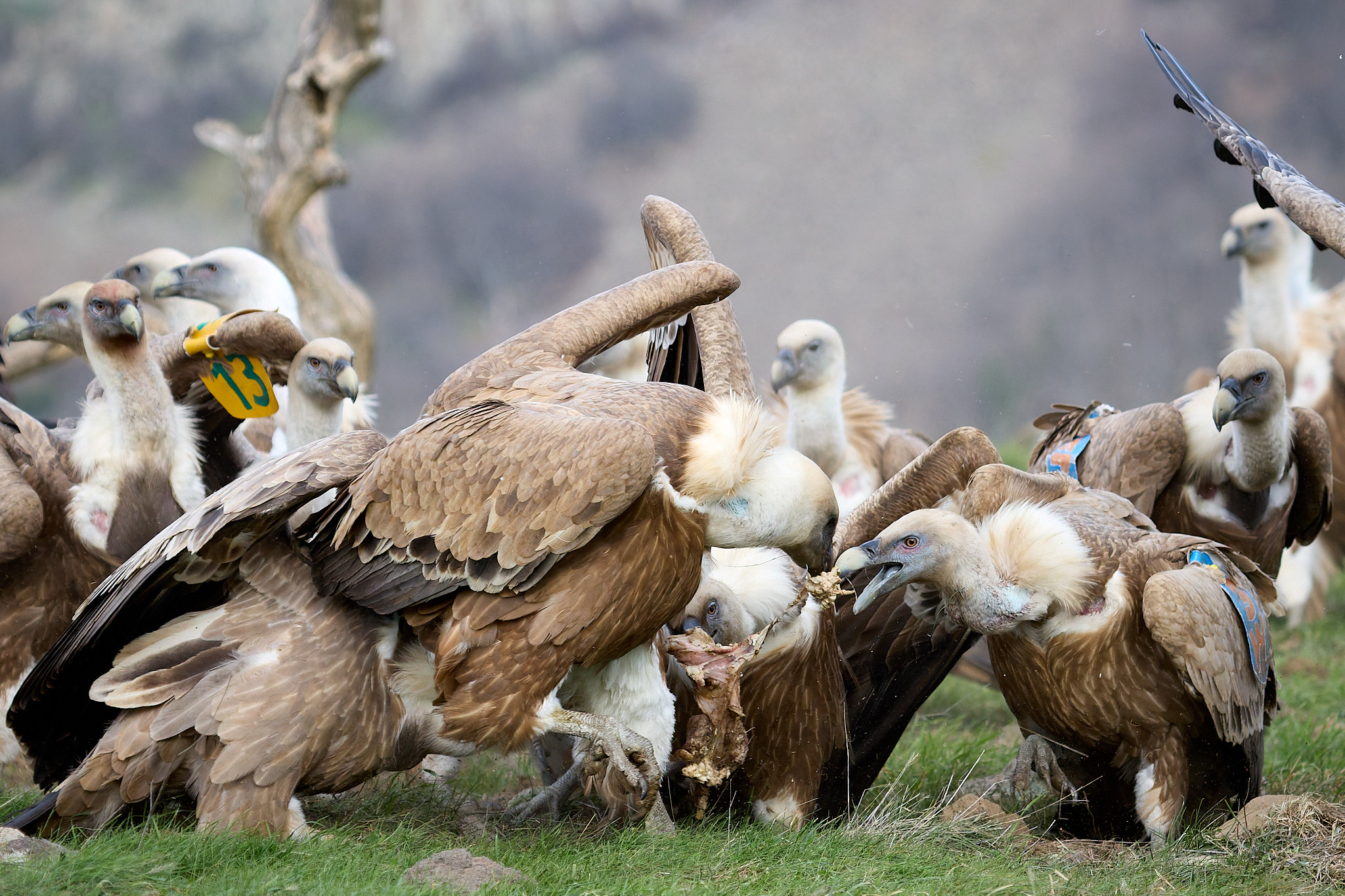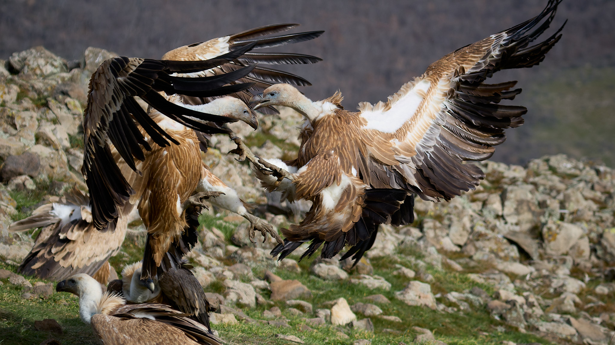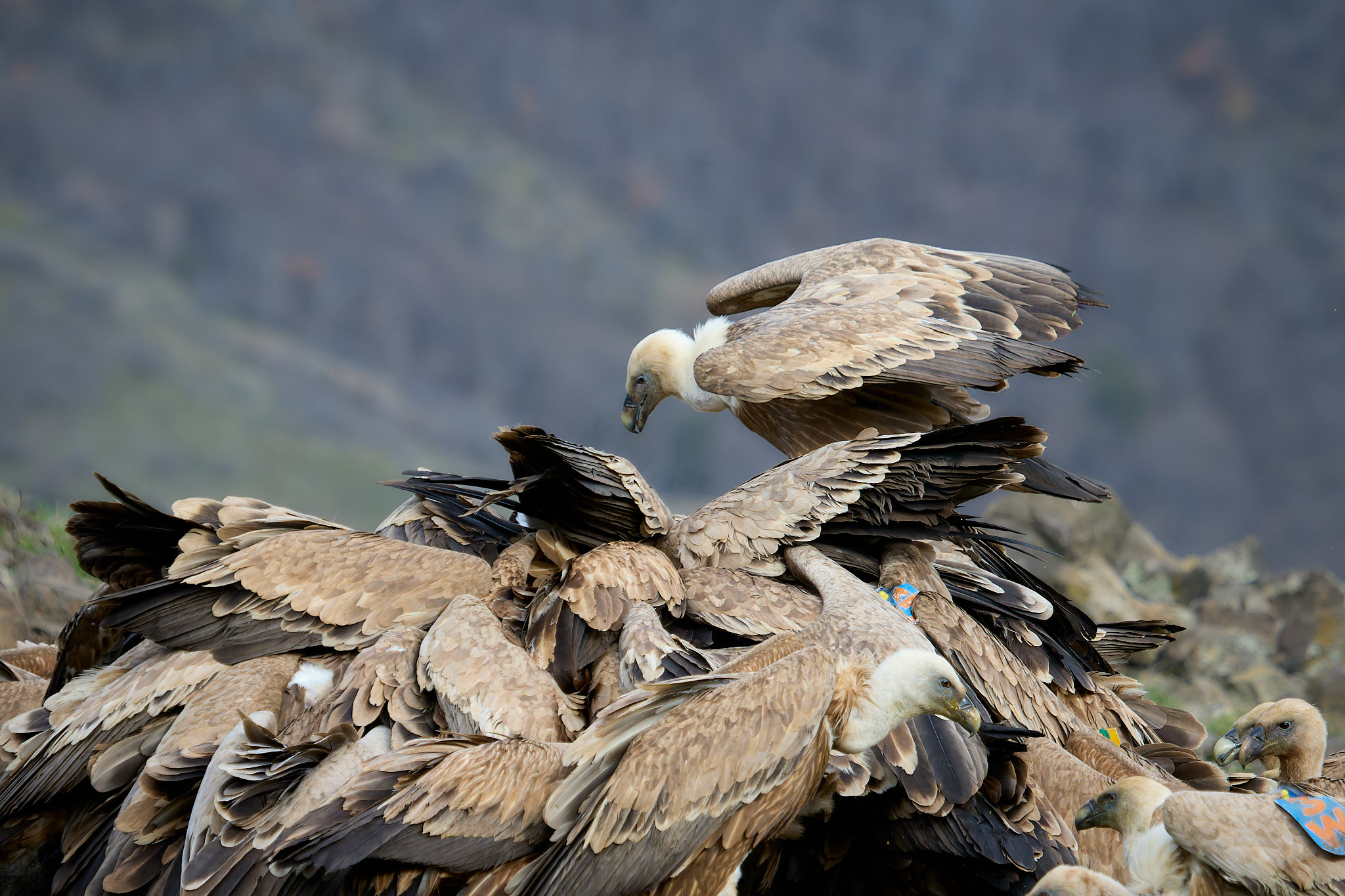 Und dann bricht plötzlich die Hölle los: ich sehe nur noch eine Menge von Flügeln, die sich auf die Köder stürzen. Die heiseren Rufe der Geier erfüllen die Luft. Und es kommen immer noch mehr dazu. Landen und eilen zu einem der beiden Federhaufen, aus denen auch immer wieder einzelne Hälse und Flügel auftauchen. Zwei Vögel streiten sich um ein Stück Fleisch, während andere mit ausgebreiteten Flügeln ihre Beute verteidigen. Sicher dreißig der großen Aasfresser tummeln sich vor uns und erzeugen einen ganz schönen Lärmpegel.