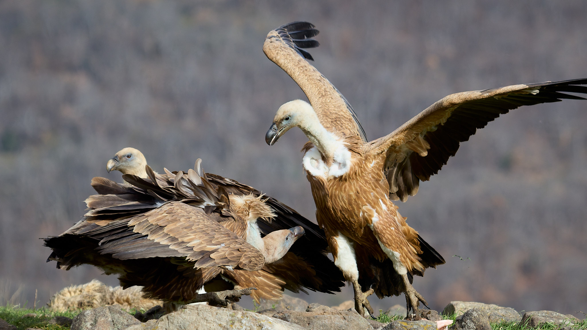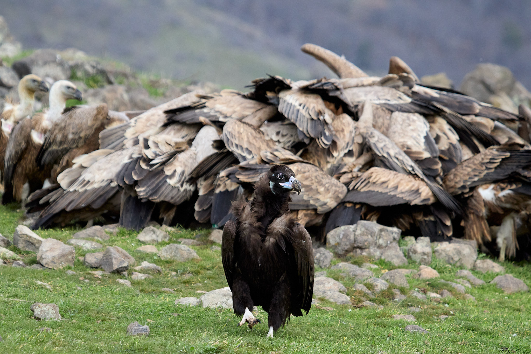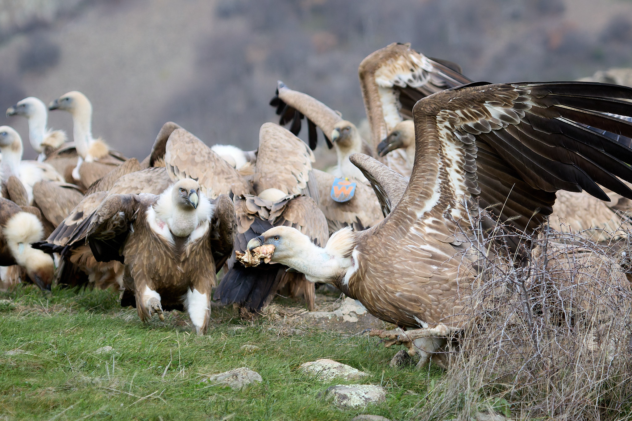 Und dann bricht plötzlich die Hölle los: ich sehe nur noch eine Menge von Flügeln, die sich auf die Köder stürzen. Die heiseren Rufe der Geier erfüllen die Luft. Und es kommen immer noch mehr dazu. Landen und eilen zu einem der beiden Federhaufen, aus denen auch immer wieder einzelne Hälse und Flügel auftauchen. Zwei Vögel streiten sich um ein Stück Fleisch, während andere mit ausgebreiteten Flügeln ihre Beute verteidigen. Sicher dreißig der großen Aasfresser tummeln sich vor uns und erzeugen einen ganz schönen Lärmpegel.