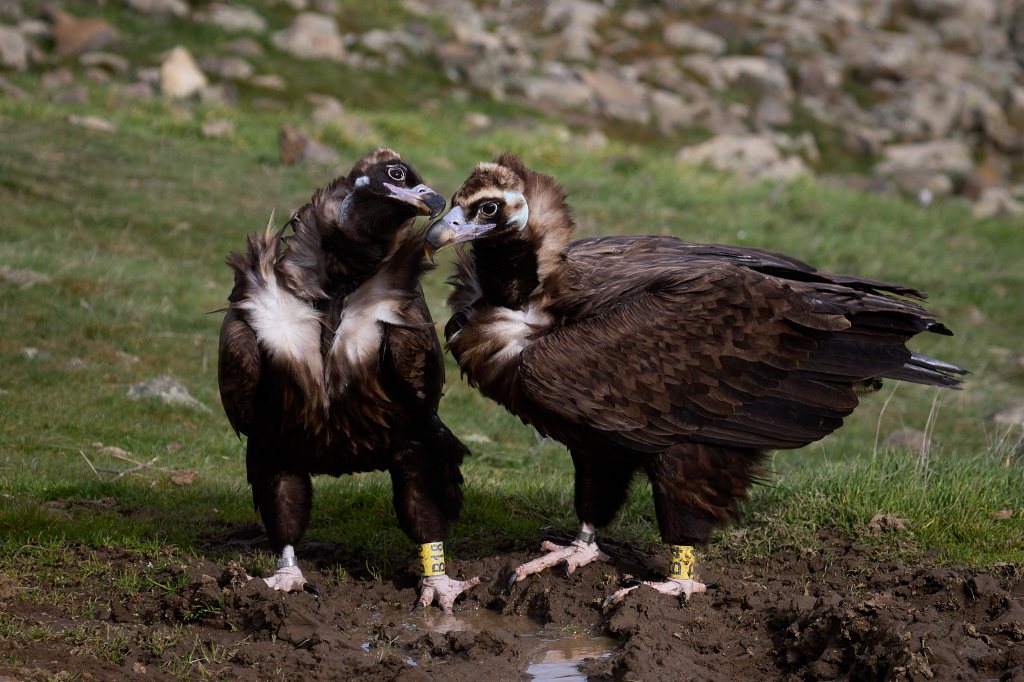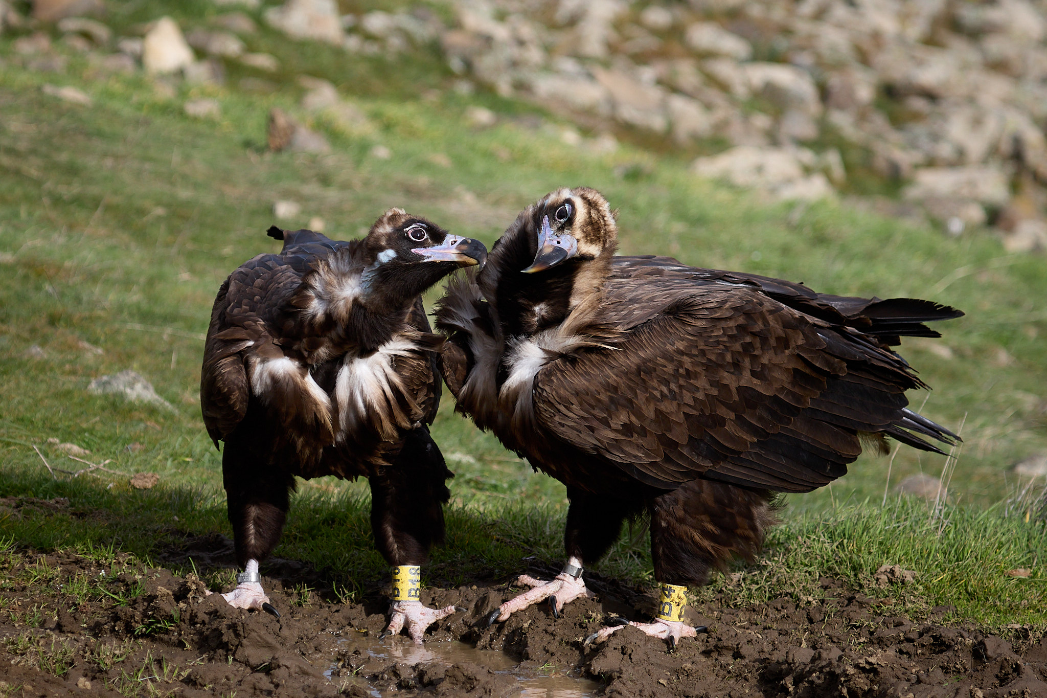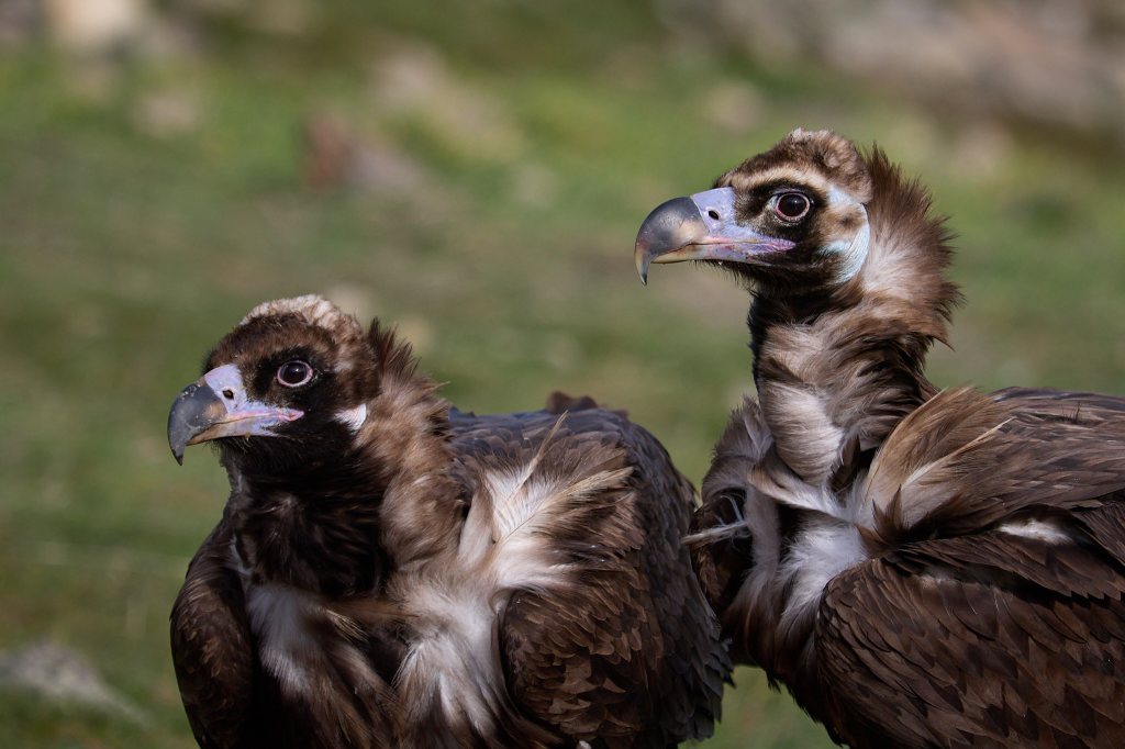 Wir schauen uns mit leuchtenden Augen an und sind auch etwas erschöpft: gute zwei Stunden hat die Schlacht ums kalte Buffet gedauert. Übrig bleiben nur zwei verliebte Mönchsgeier, die sich gegenseitig zärtlich mit den Schnäbeln stupsen.