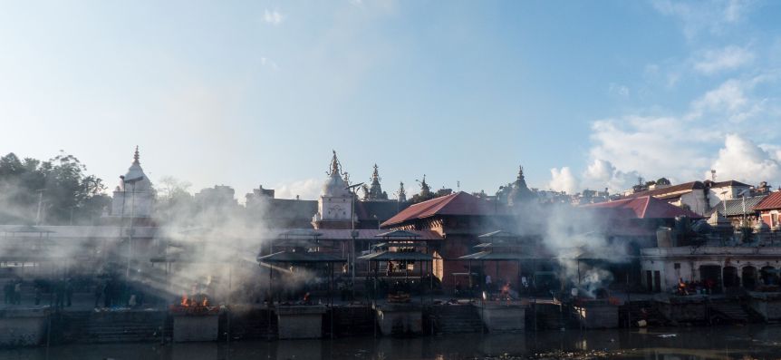 Dunkle Rauchschwaden steigen hinter den Toren zum Tempel-Komplex des Pashupatinath auf. Einige Touristen stehen vor dem Eingang, etwas unschlüssig. Auch Read more